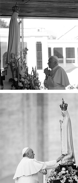Os papas Bento XVI e Francisco rezam diante da imagem de Nossa Senhora de Fátima [Paulo Amorim / VWPics / Alamy Stock Photo | Alessandra Benedetti / Getty Images]